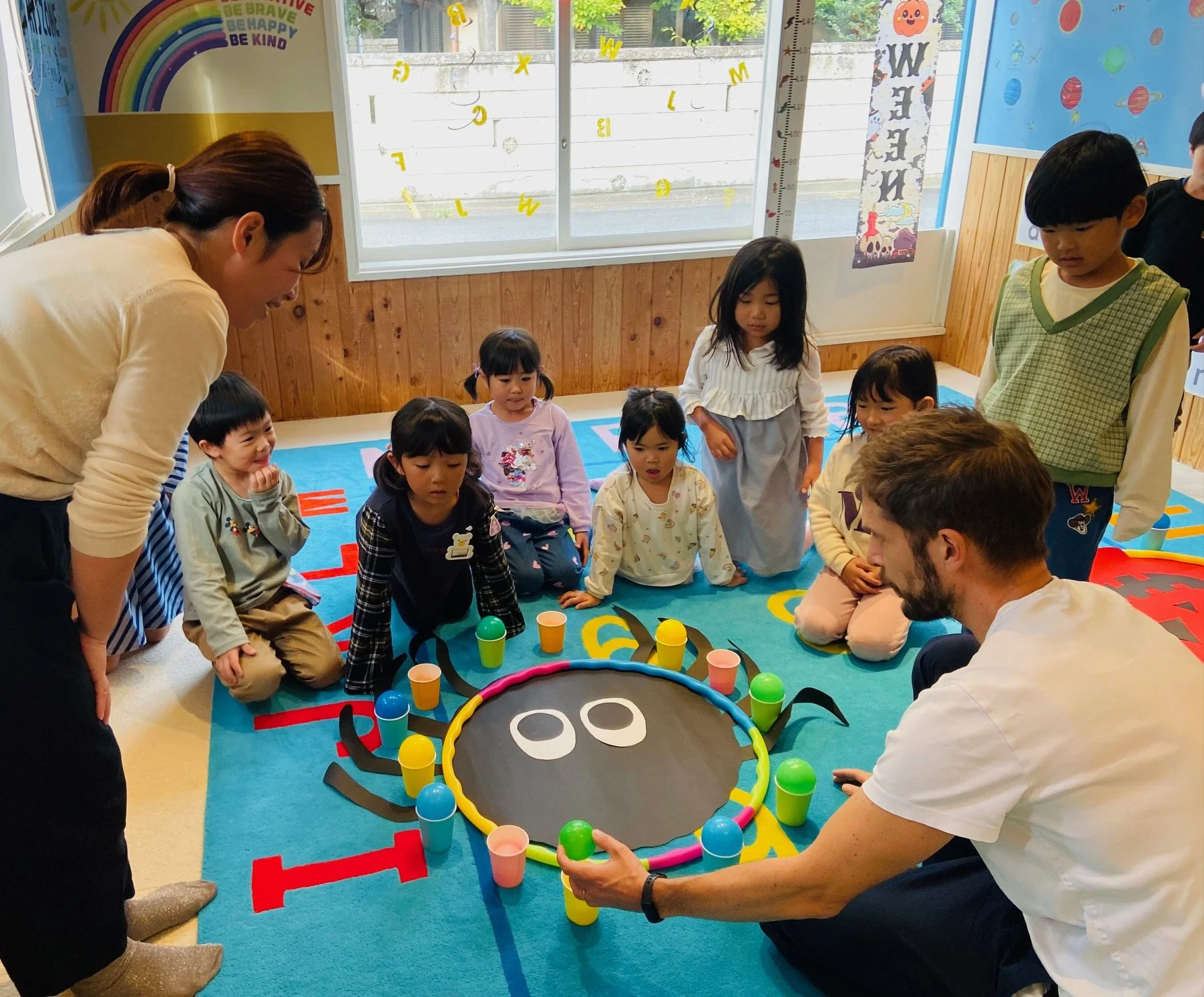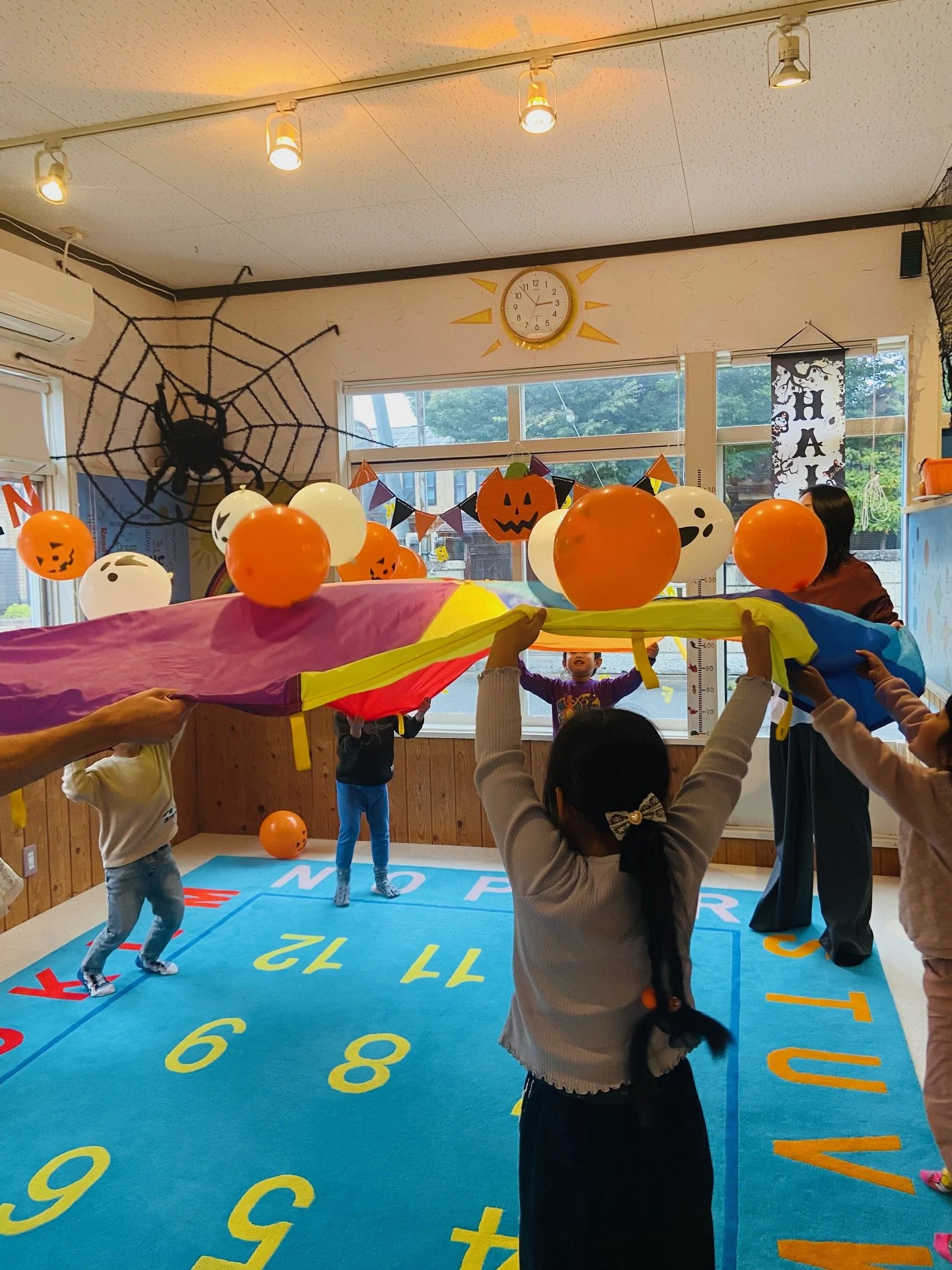 Halloween activity!!!! ☆☆Halloween Balloon catch☆☆ Up and down! Round and round! Big and small circle! Balloon を落とさないようにTeam workが大切だね!